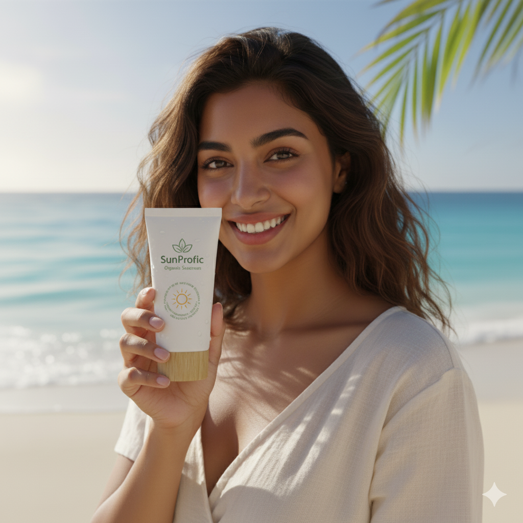 SunProfic Organic Sunscreen is made with 100% natural ingredients like Aloe Vera, Turmeric, and Vitamin E to protect your skin from harmful UVA & UVB rays. Its lightweight formula gives a smooth matte finish with no white cast, perfect for all skin types.